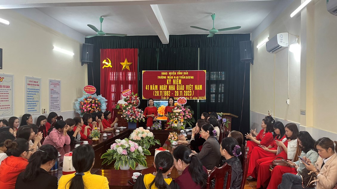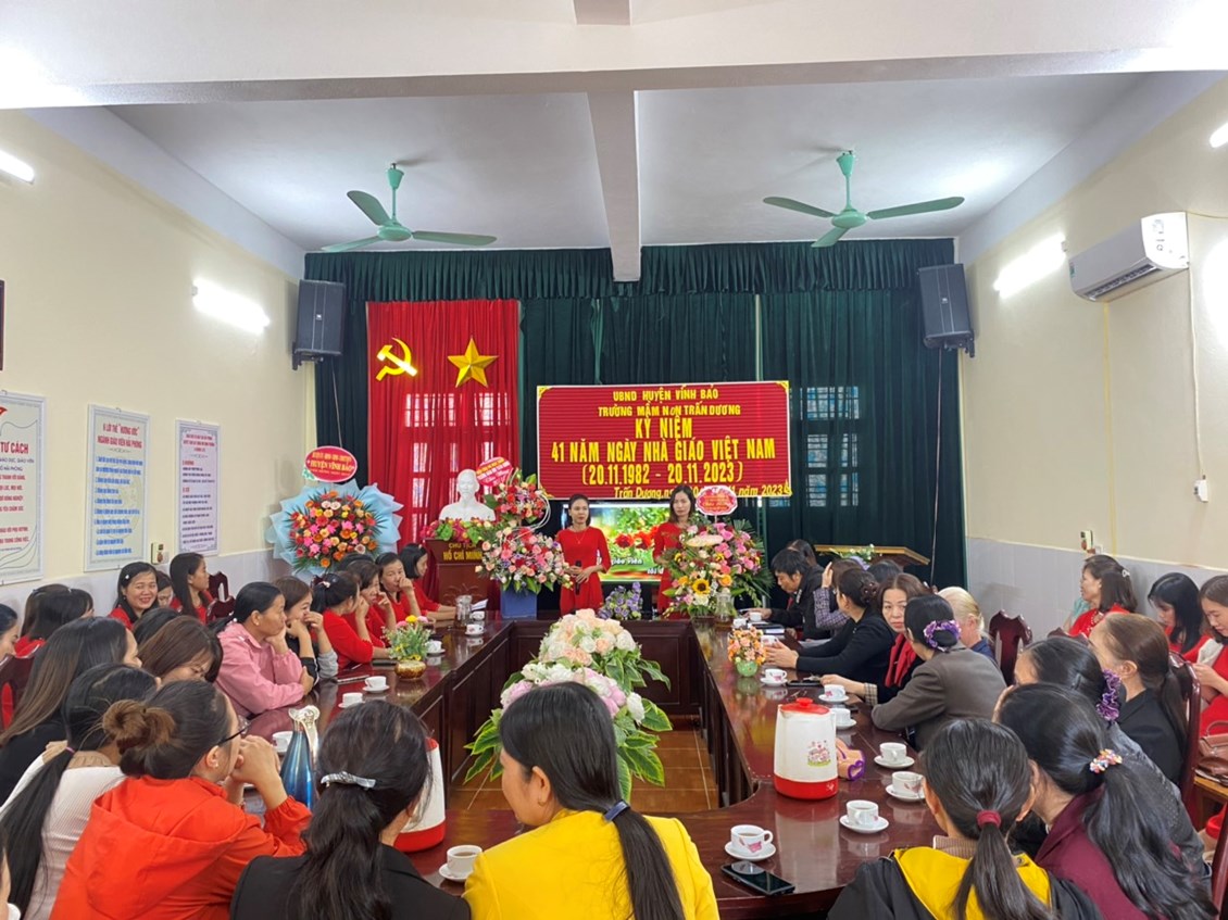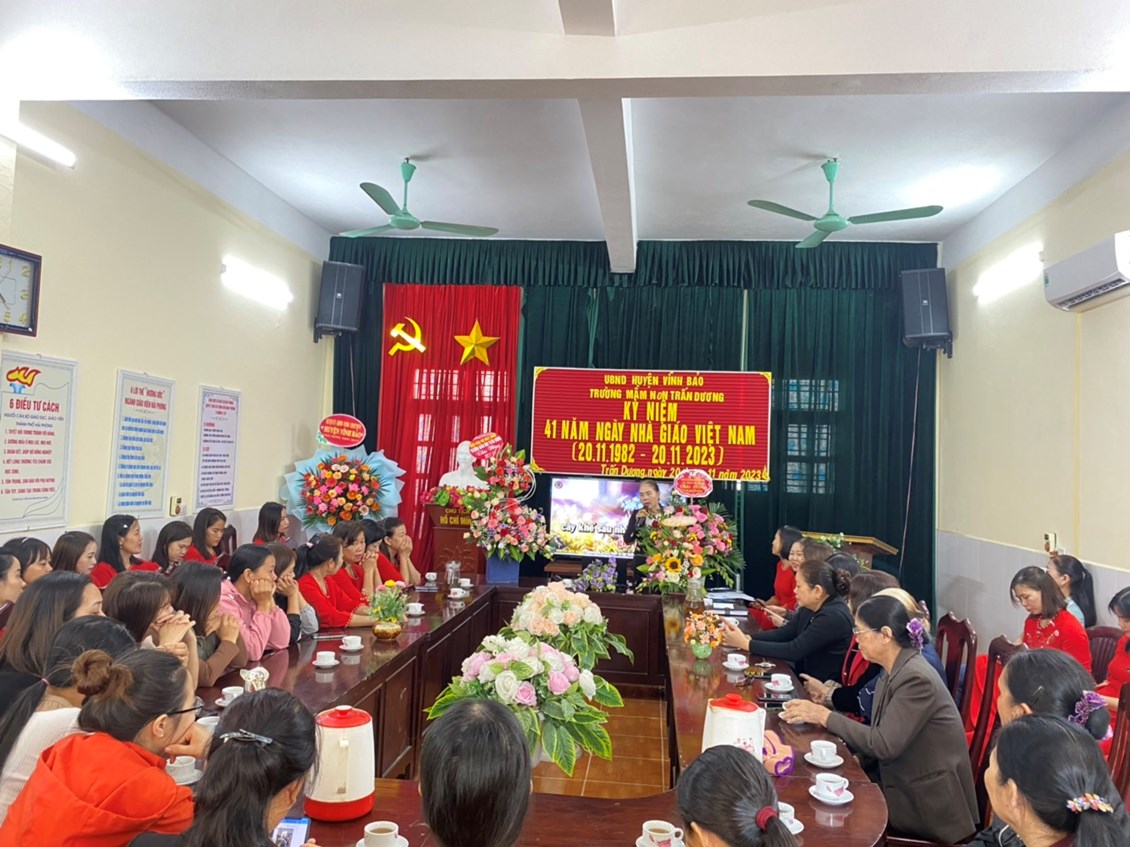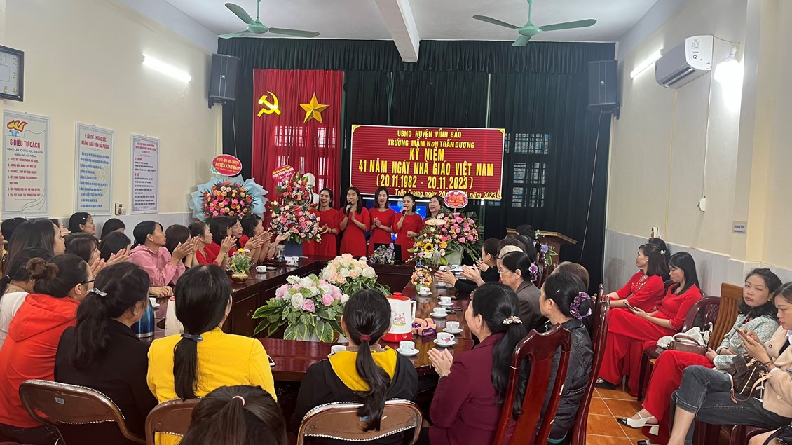 Về dự hội nghị Nhà trường đã nhận được những lẵng hoa tươi thắm và những lời chúc mừng của Huyện ủy, HĐND, UBND, UBMTTQ huyện Vĩnh Bảo; Các đồng chí đại diện cho lãnh đạo địa phương, Ban đại diện CMTE, các đồng chí Hội cựu Giáo chức MN, trạm y tế xã Trấn Dương. Ngày Kỷ niệm 41 năm ngày Nhà giáo Việt Nam đã diễn ra thành công tốt đẹp.