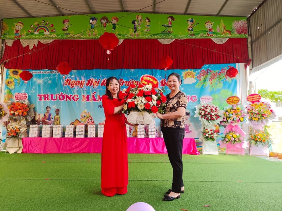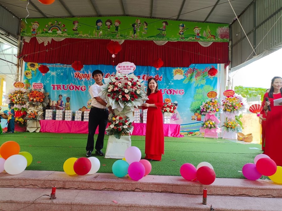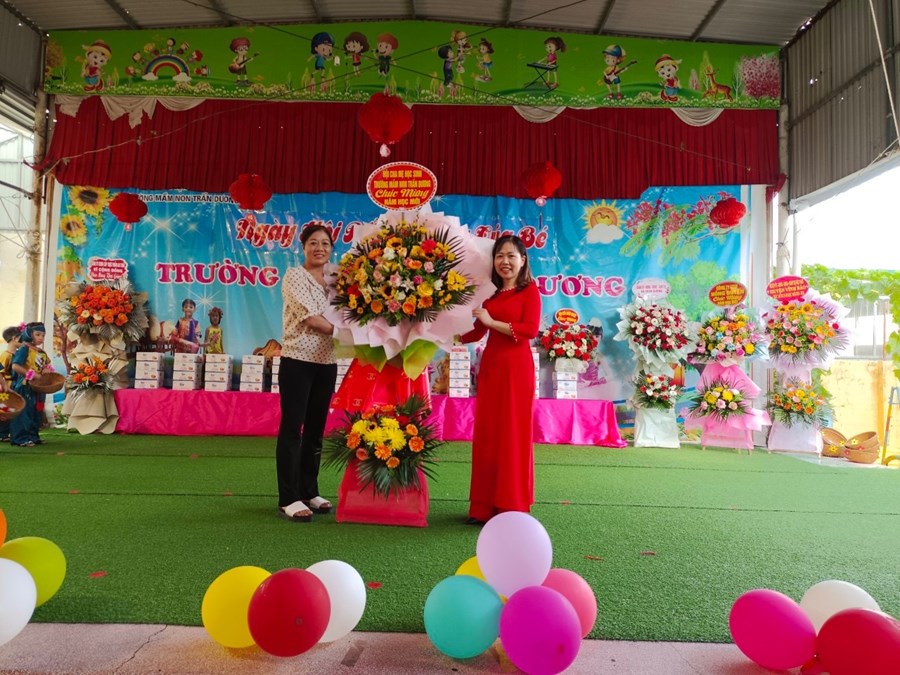 Bà Nguyễn Thị Thúy ( Ban chấp hành Hội CMTE trường mầm non Trấn Dương ) tặng hoa chúc mừng