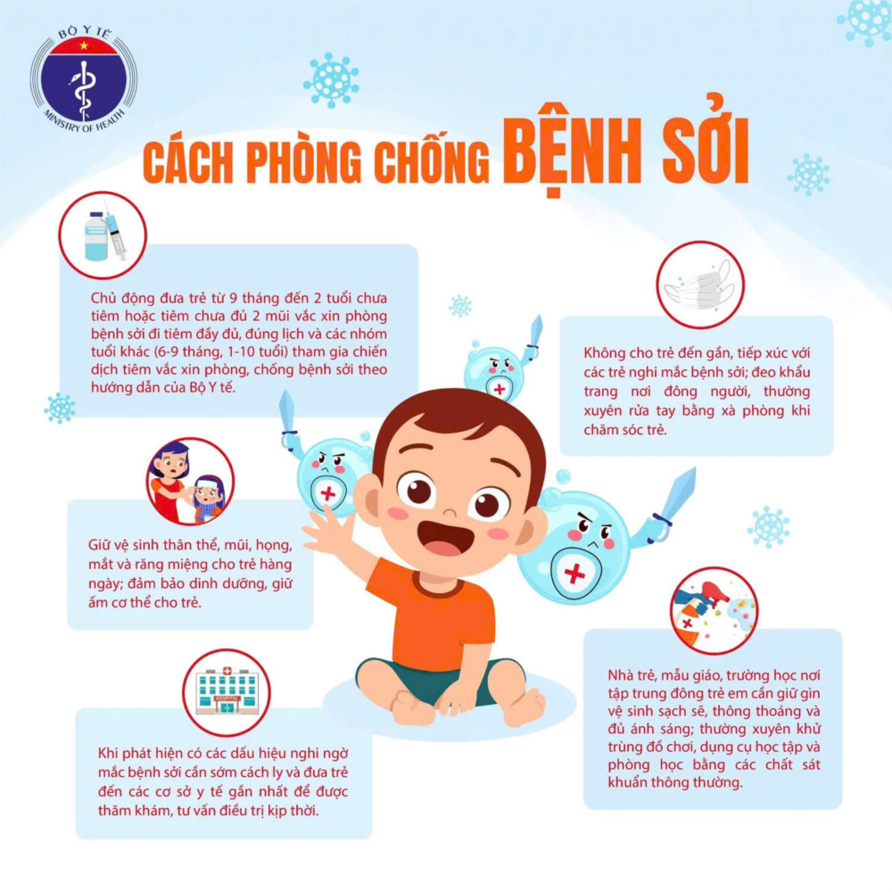 Bệnh sởi là một trong những nguyên nhân gây tử vong hàng đầu ở trẻ em do các biến chứng viêm phổi, viêm não, tiêu chảy nặng và suy dinh dưỡng. Bệnh sởi chưa có thuốc điều trị đặc hiệu, tiêm vaccine là biện pháp hữu hiệu để phòng bệnh. Sau đây là 10 thông điệp phòng chống bệnh sởi của Bộ Y tế: