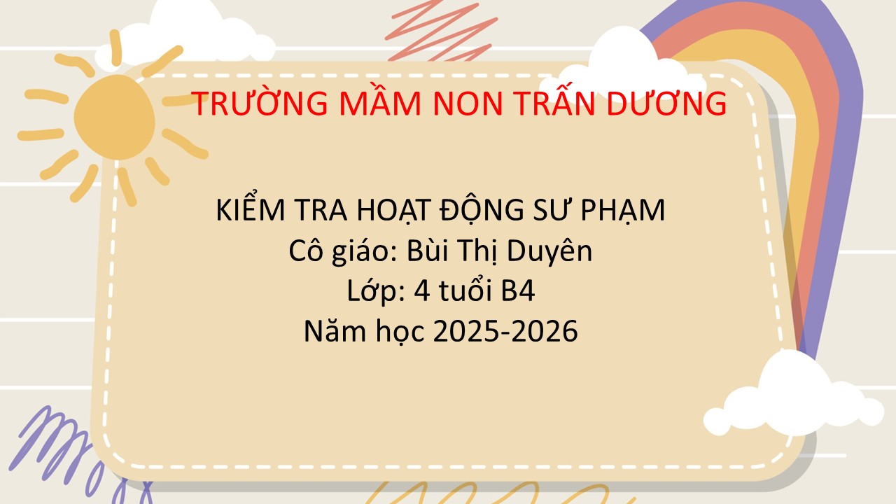 Hoạt động kiểm tra hoạt động sư phạm giáo viên mầm non có ý nghĩa quan trọng trong việc nâng cao chất lượng chăm sóc, giáo dục trẻ. Thông qua kiểm tra, nhà trường kịp thời đánh giá năng lực chuyên môn, phương pháp tổ chức hoạt động và tinh thần trách nhiệm của giáo viên. Đây cũng là cơ hội để giáo viên tự nhìn nhận, rút kinh nghiệm và điều chỉnh cách dạy học cho phù hợp với đặc điểm phát triển của trẻ. Đồng thời, công tác kiểm tra góp phần xây dựng môi trường giáo dục nghiêm túc, chuyên nghiệp và hiệu quả. Nhờ đó, chất lượng nuôi dưỡng, chăm sóc và giáo dục trẻ ngày càng được nâng cao. Dưới đây là một số hình ảnh kiểm tra hoạt động sư phạm của cô giáo Bùi Thị Duyên: